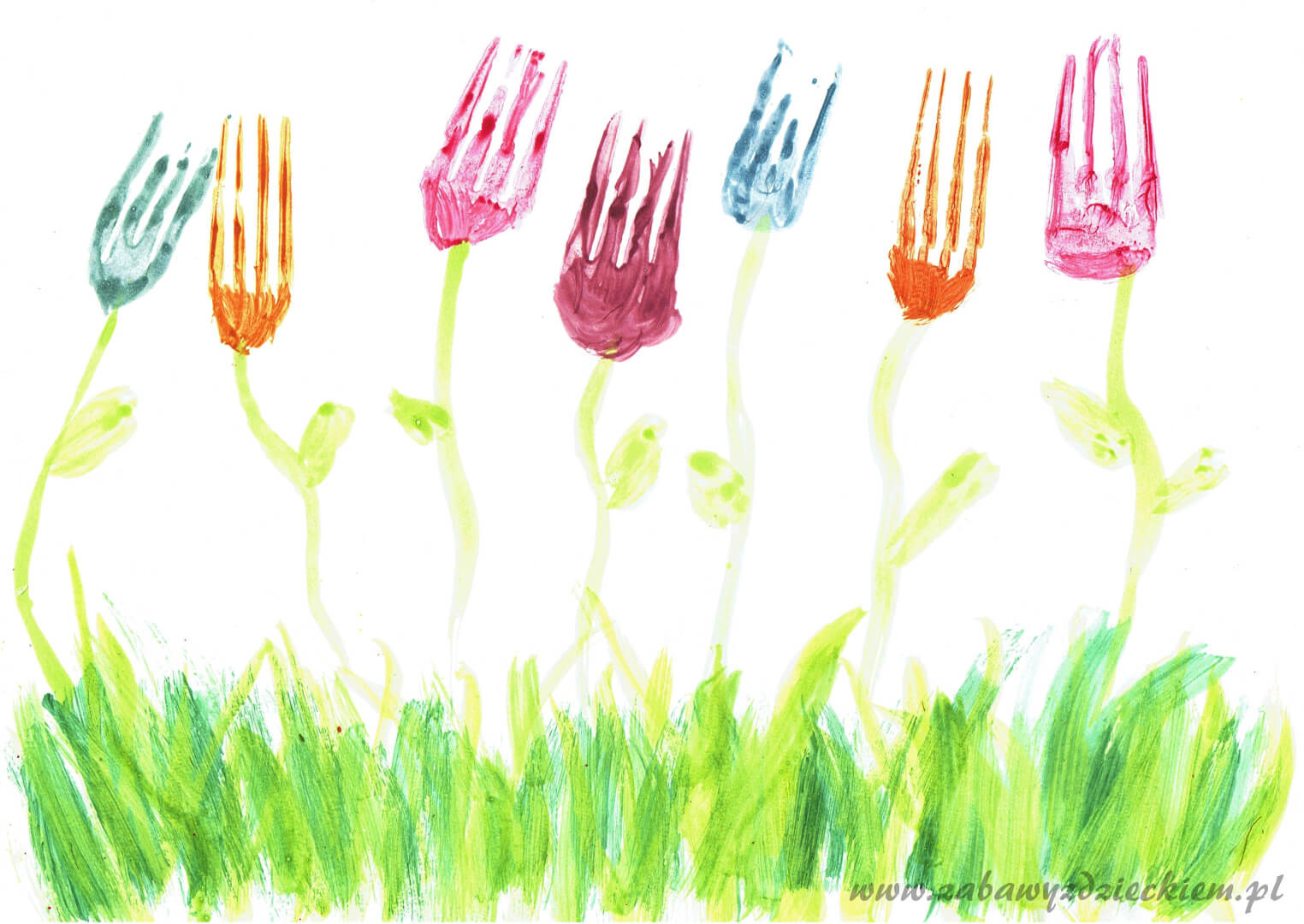 Najpierw na kartce malujemy trawę oraz łodygi tulipanów zieloną farbą. Następnie pokrywamy farbą zęby widelca i przyciskamy je do kartki, aby odbić kształt kwiatu na łodydze. Zmieniamy farbę i odbijamy kolejne kwiaty tulipanów, dokładnie dociskając. Gotową pracę odstawiamy do wyschnięcia.