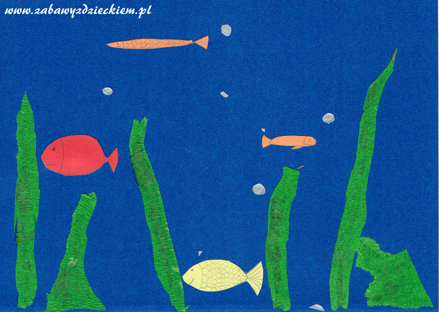 Wszystkie wycięte elementy, czyli rybki i wodorosty, przyklejamy na jedną ze stron zgiętej kartki. Dodatkowo, jeśli chcemy, aby ilustracja była bardziej realistyczna i efektowna, możemy dodać wycięte z papieru małe kółeczka, które będą przedstawiać pęcherzyki powietrza.