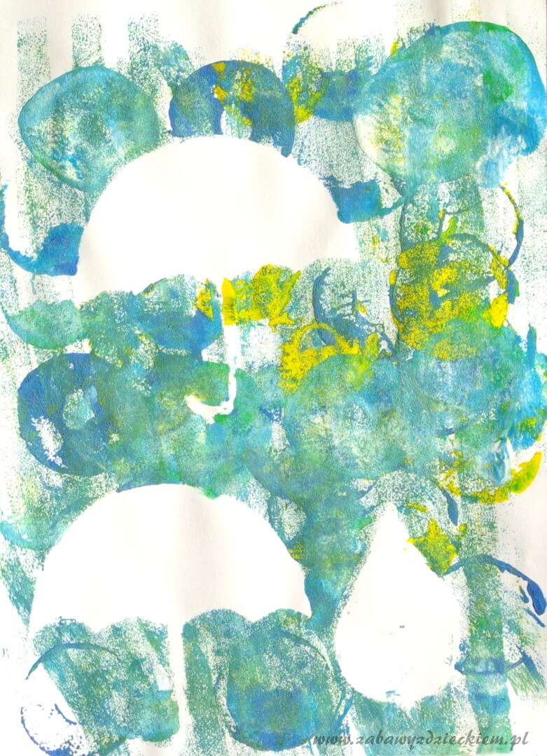 biała kartka bloku rysunkowego A4, tektura lub brystol, nożyczki, ołówek, farby, pędzel, gąbki do naczyń lub do kąpieli, małe pojemniczki na wodę