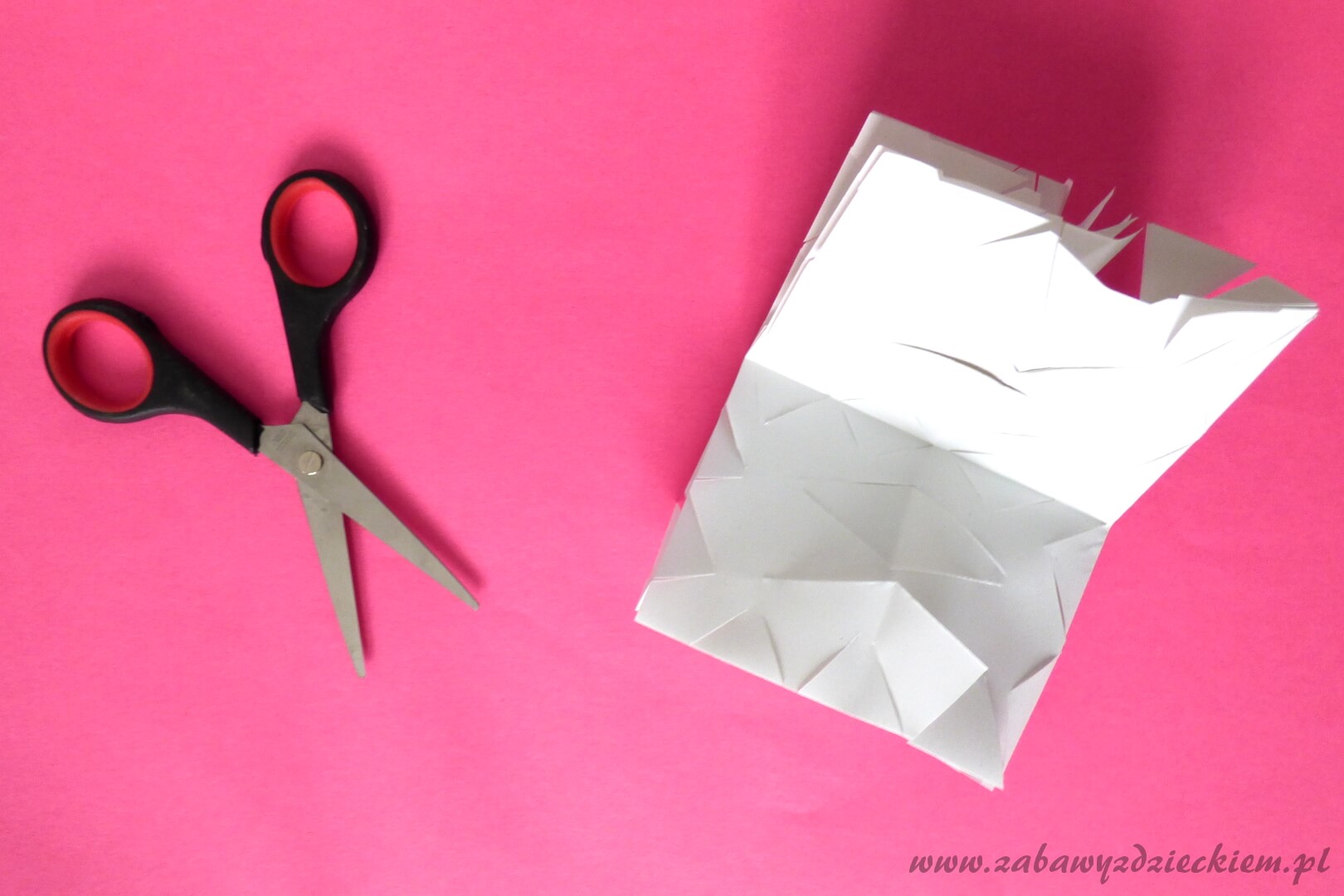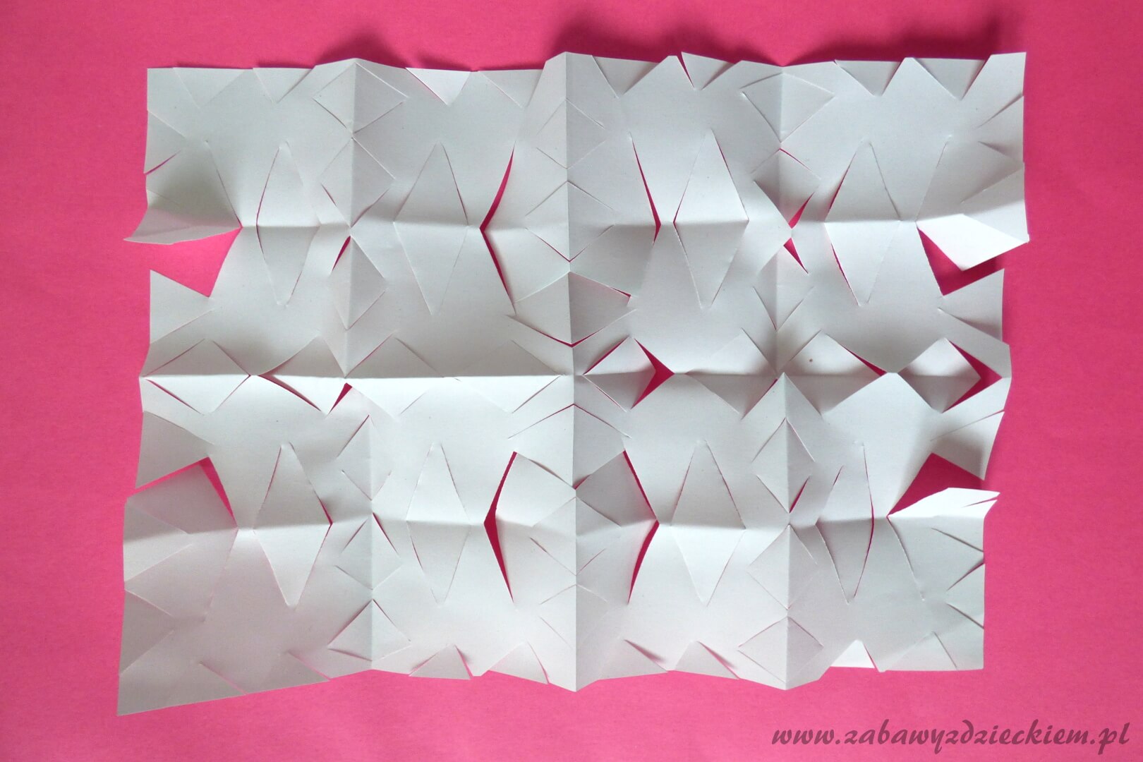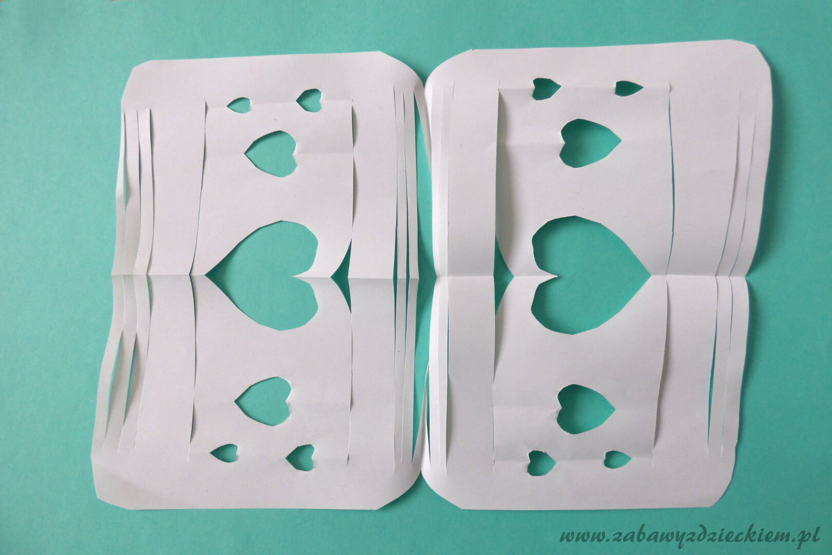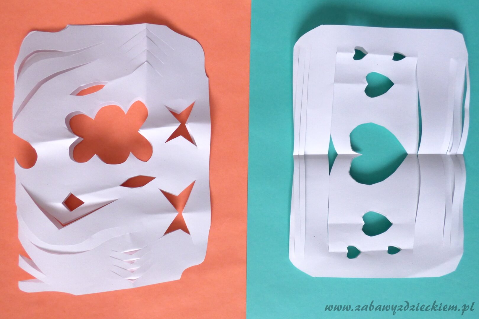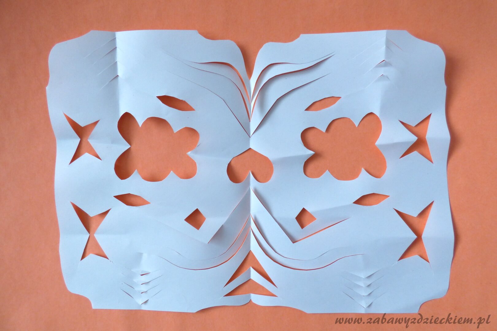 Składamy kartkę na pół, a następnie w miejscu zgięcia wycinamy dowolne wzorki. Na koniec rozkładamy kartkę, by zobaczyć rezultat. Aby wycinanka była ciekawsza i miała więcej wzorów, możemy złożyć kartkę kilkukrotnie i wycinać wzory na tej samej zasadzie. Wzory można wcześniej zaprojektować i narysować na kartce ołówkiem.